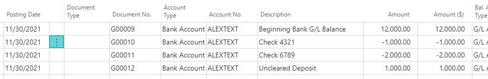 Once you post the entries via General Journal (make sure the Account Type is Bank Account), run your first bank reconciliation as November 30th, or the period before you go live.