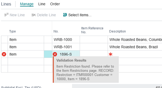 With the Item Restriction/Approval record enabled, you will receive an error message if you try to use an item listed in the restriction.