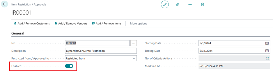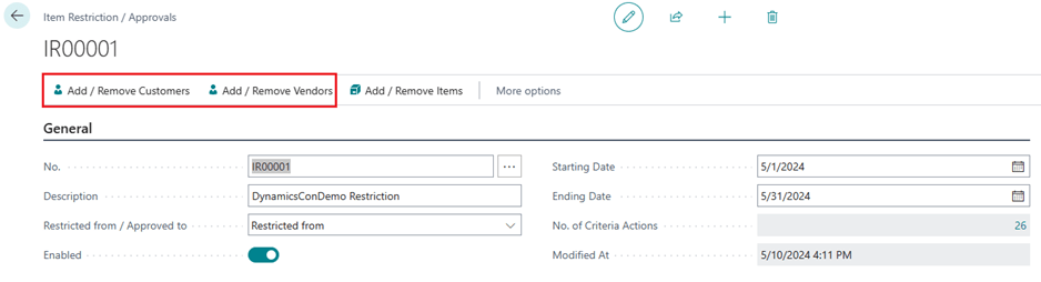 - Restricted From – Indicates that the customer, vendor, and items that are on this item restriction is blocked from sales / purchase.