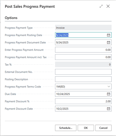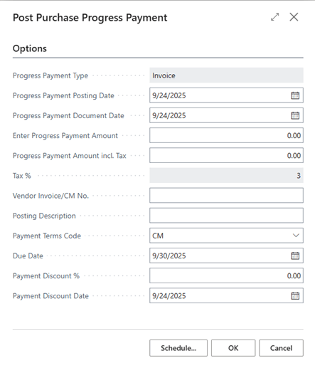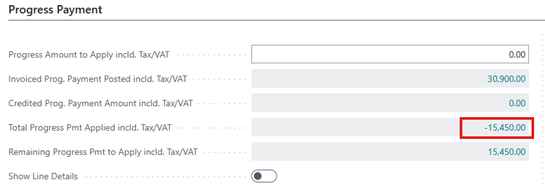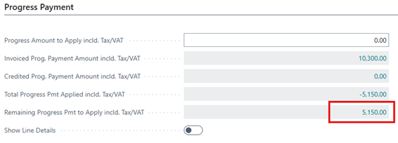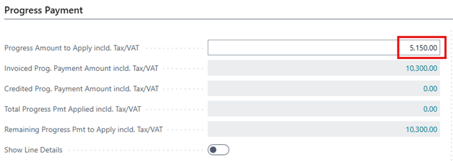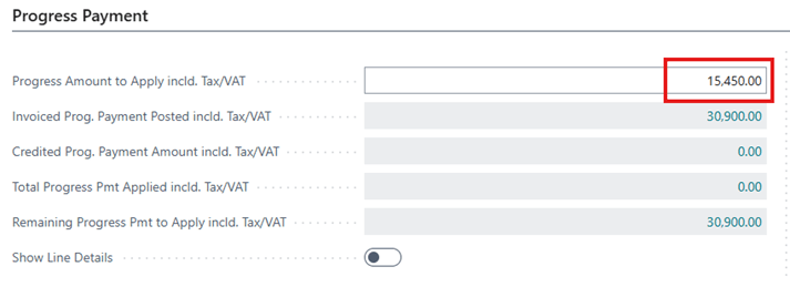 *The amount in the Progress Payment Amount incld. Tax will be the total amount invoiced. You can either enter the total amount of the Progress Payment in that field, or enter an amount in the Enter Progress Payment Amount field and let Business Central calculate the tax amount.