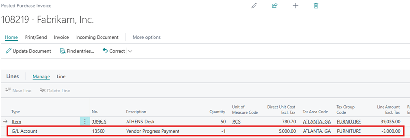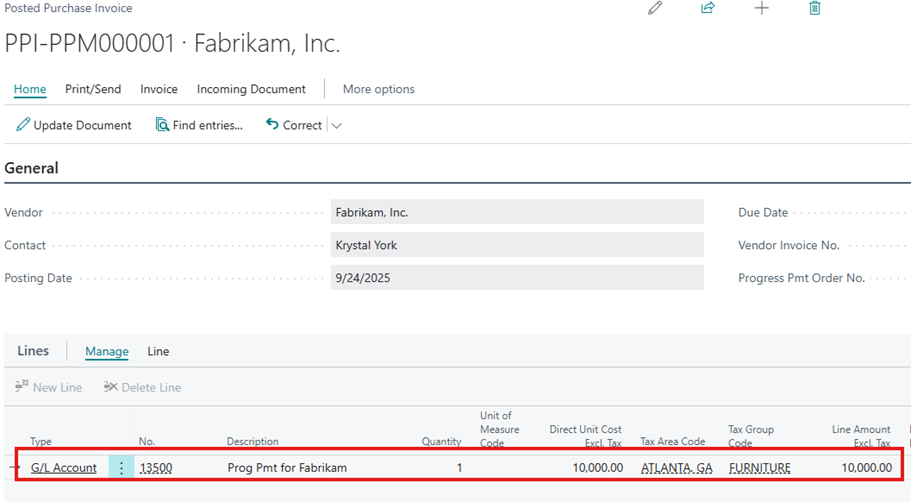 - The Progress Payment is listed in the Lines section of the Posted Purchase invoice