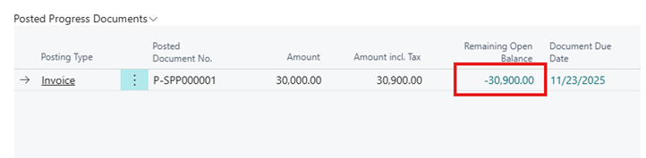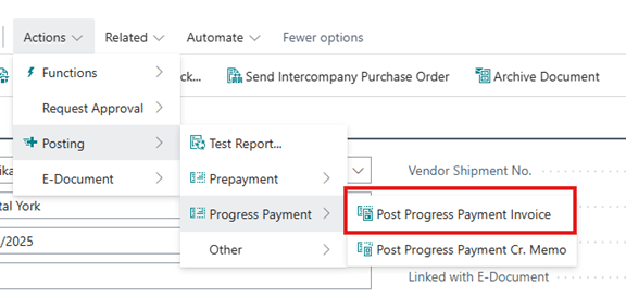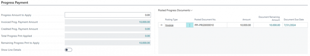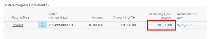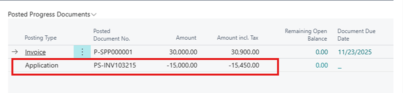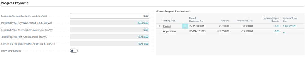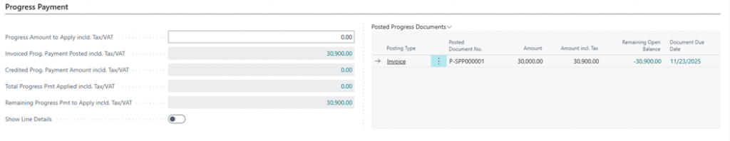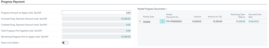 - The Progress Payment group will now show that a Progress Payment Invoice has been posted against the Purchase order.