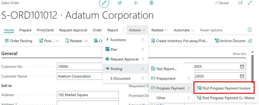 - The Progress Payment group will now show that a Progress Payment Invoice has been posted against the sales order.