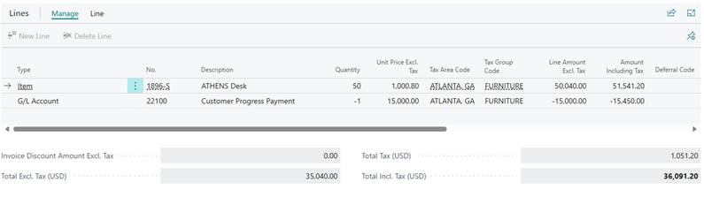 - When you review the posted invoice, the Progress Payment are recognized on the lines