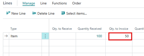 - Enter the Qty. to Invoice that you will be posting for the current Purchase order.